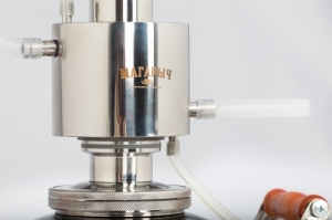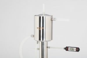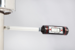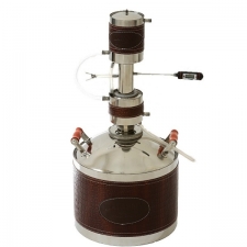 Изменился и перегонный куб аппарата, он остался все того же объема - 12 литров, но теперь стал шире и ниже, что позволяет быстрее прогревать его и увеличивает эффективную площадь испарения. При этом горловина аппарата осталась широкой и ручки аппарата сделаны из дерева. Так же в аппарате предусмотрена возможность установки электронного термометра взамен обычного (аналогового) для точного контроля температуры паров при отборе по фракциям. Электронный термометр может устанавливаться как сбоку в ректификационную царгу, так и в верхнюю часть дефлегматора. Обращаем ваше внимание, что в базовой комплектации аппарата электронного термометра нет, но его можно докупить отдельно в нашем магазине, при этом использовать аппарат можно как с термометром, так и без.
