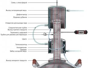 Самогонный аппарат Магарыч "Машковского" ЭКСПОРТ - это новая, усовершенствованная модель дистиллятора "Машковского" от Челябинского завода бытовых товаров. Аппарат получил красивый внешний вид, а его техническая часть была значительно доработана, что повысило производительность аппарата почти в два раза. Благодаря новой конструкции холодильника аппарат способен выдавать до 3-х литров дистиллята в час и существенно экономить ваше время. Функцию сухопарника теперь выполняет колонна, а холодильник (дефлегматор), расположенный в её верхней части стал прямоточным, и состоит из стакана и охлаждающей водяной рубашки. В верхней части стакана имеется штуцер связи с атмосферой, используемый в режиме ректификации или для установки термометра в режиме дистилляции. Еще один штуцер для горизонтальной установки термометра предусмотрен в колонне сбоку, перед входом в основной холодильник. Из-за очень высокой производительности дефлегматора на его выходе получается очень горячий дистиллят, поэтому в нижней части колонны установлен дополнительный холодильник который позволяет получать охлажденный продукт на выходе.
